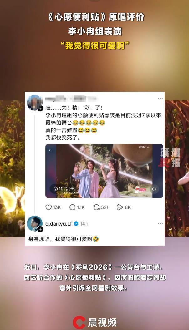 据4月13日晚间报道,李小冉在《乘风2026》一公舞台上,与王濛、唐艺昕合作的一曲《心愿便利贴》,因为演唱全程跑调忘词,却意外引爆了全网喜剧效果,成了近期最具话题性的“翻车”舞台。